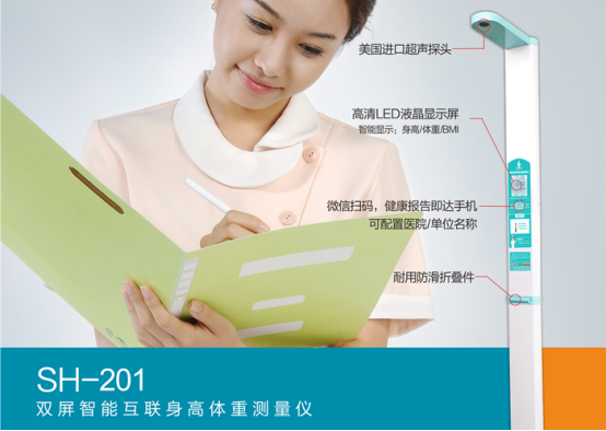 SH-201型雙屏智能身高體重測量儀是傳統數碼管身高體重測量儀的升級款,彌補了數碼管體重秤顯示效果單一,語音播報生硬的缺點。傳統的數碼管語音播報為機器播報,較為生硬;而SH-201型雙屏超聲波身高體重測量儀則采用智能語音播報,播報語音更人性化;雙屏采用高清的LED液晶顯示屏,可智能顯示身高、體重、BMI指數, 另一個屏幕可配置醫院或者使用單位名稱,同時測量結果可以微信掃碼,兼具廣告宣傳和微信吸粉功能,展示效果更好。而在定價上,幾乎等同于數碼管秤的價格,真正的做到了增值不加價,更多讓利給客戶。